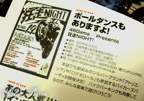 それから・・・11月19日に竜ヶ崎BORRACHOS(ボラチョス)様で行われますバイカーズパーティー「狂走NIGHT」の告知も掲載して頂きました。