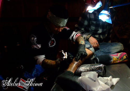 こちらではダイ君が施術中。彫られているのはカブさん。