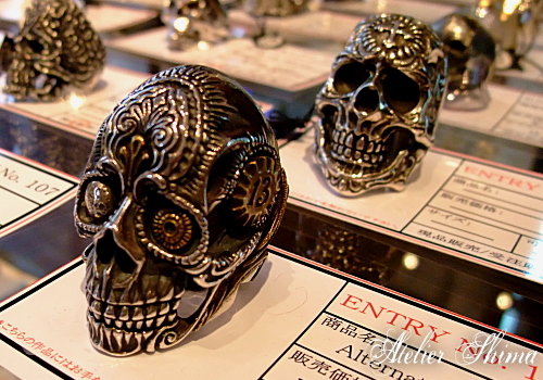髑髏王を目指して製作された120以上のスカルリングが一同に展示されている様子は、まさに圧巻でした。