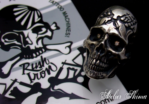 スカルリングの額には、SKIN EVOLUTION(スキンエボリューション)のロゴマークにも使用されているクロス(交差)するタトゥーマシーン。