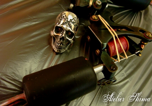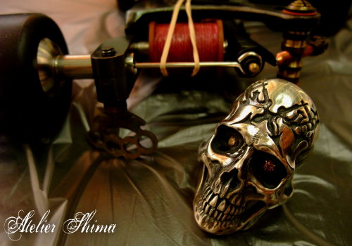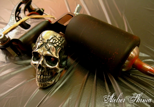 スカルリングの額に交差するタトゥーマシーンを彫り込むカスタムでしたので、施術を終えたばかりのタトゥーマシーンをバックに撮影をしてみました。