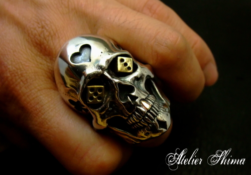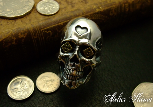 スカルの各部にスート ( スペード、ハート、ダイヤ、クラブ)を彫り、両目には真鍮製のダイス。