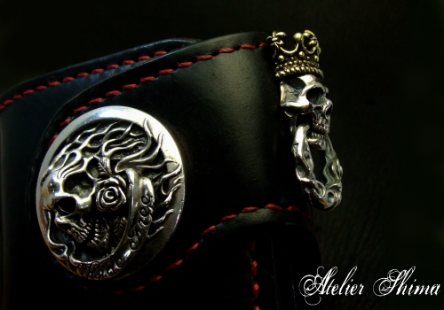 他では見られないデザインというのはもちろんなのですが、双方がデザインしたインディアンスカルの羽飾りが枠から飛び出しているという部分も力強く、お互いの作品が絡み合う事でより世界観が色濃くなったスペシャルウォレットです。