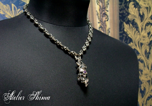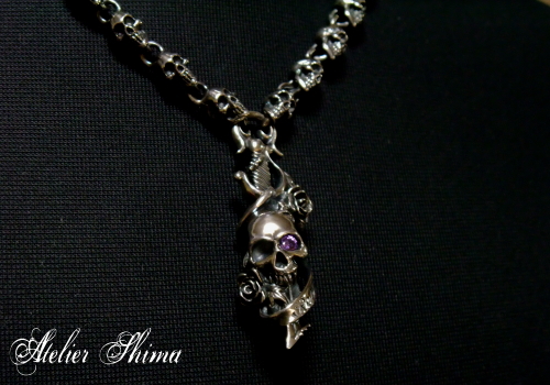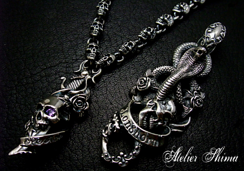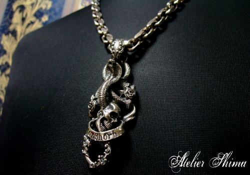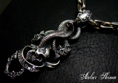 続きまして、コブラのモチーフに、スカル、薔薇、リボンをバランス良くデザインしたペンダントのご紹介です。