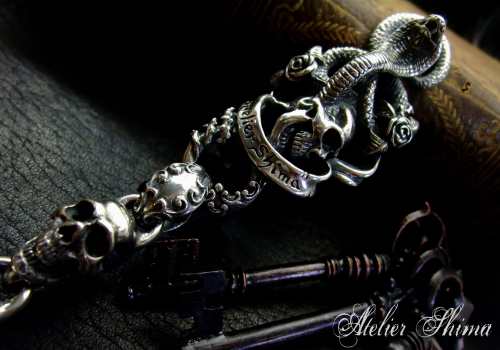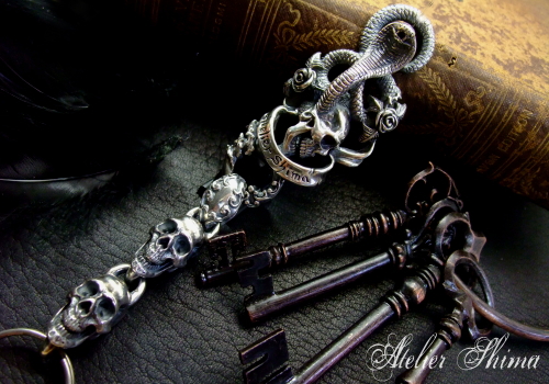 コブラもスカルもダーク過ぎるモチーフなので、連結部には西洋のアンティークなどに使われていた彫刻を施し、キーチェーン全体を高貴な雰囲気に仕上げました。
