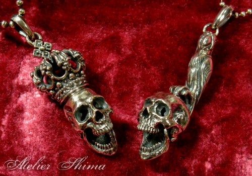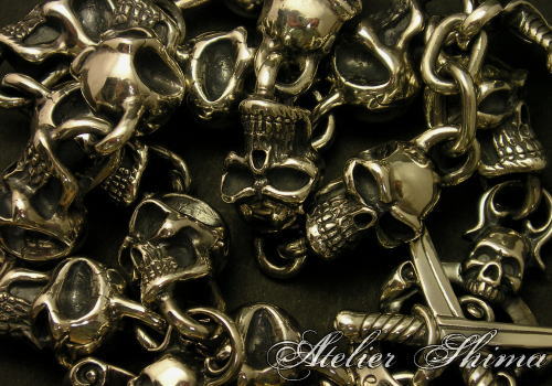 スカルが連結した長めのネックチェーンは存在感が抜群です。