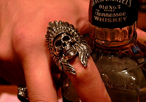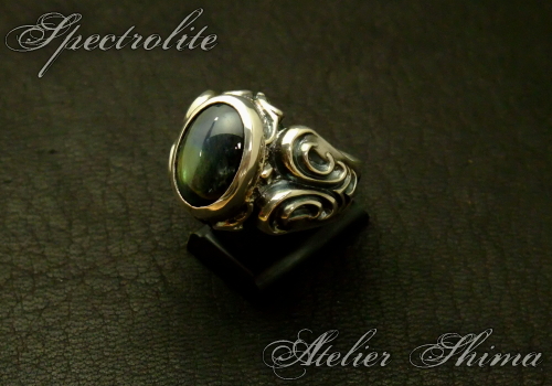 こちらは宝石の中にスカルが浮かび上がるHermit Skull Ringに、幻想的な虹色の輝きを放つスペクトロライトをセッティングしたカスタムアイテムになります。