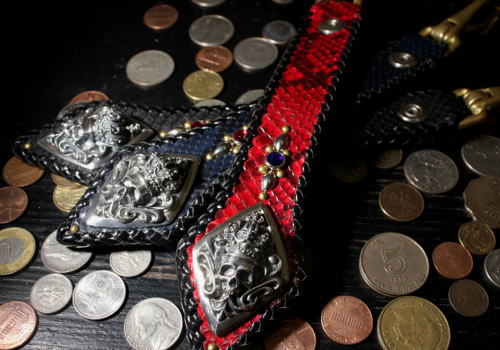 一般的なスタッズレザーブランドで使用されているアクリルストーンでは表現出来ない輝きを放つ、スワロフスキークリスタルを贅沢に使用し、ヴィンテージレザーベルトの様な無骨な質感や風合いに変化する真鍮スタッズとキーホルダー金具。