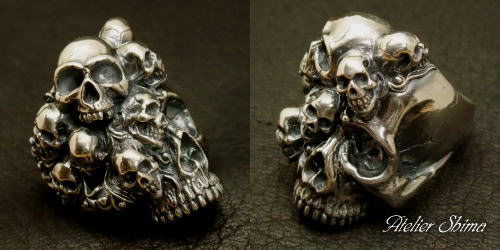 その名の通り、大きさの異なる9つのスカルが不気味に存在感を主張するリングです。